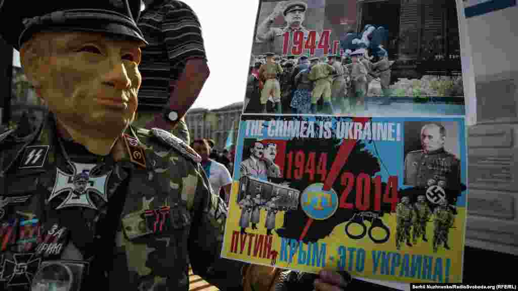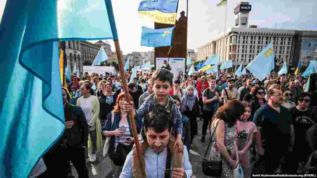Kyivde faaller sürgünlikniñ 75 yıllığına bağışlap avtoyürüş keçirdi. Maşna kolonnası "Ekspotsentr Ukrainı" Milliy Kompleksiniñ yanında toplanıp, Mustaqillik Meydanını yol tuttı, anda ise aqşam matem mitingi keçirildi.